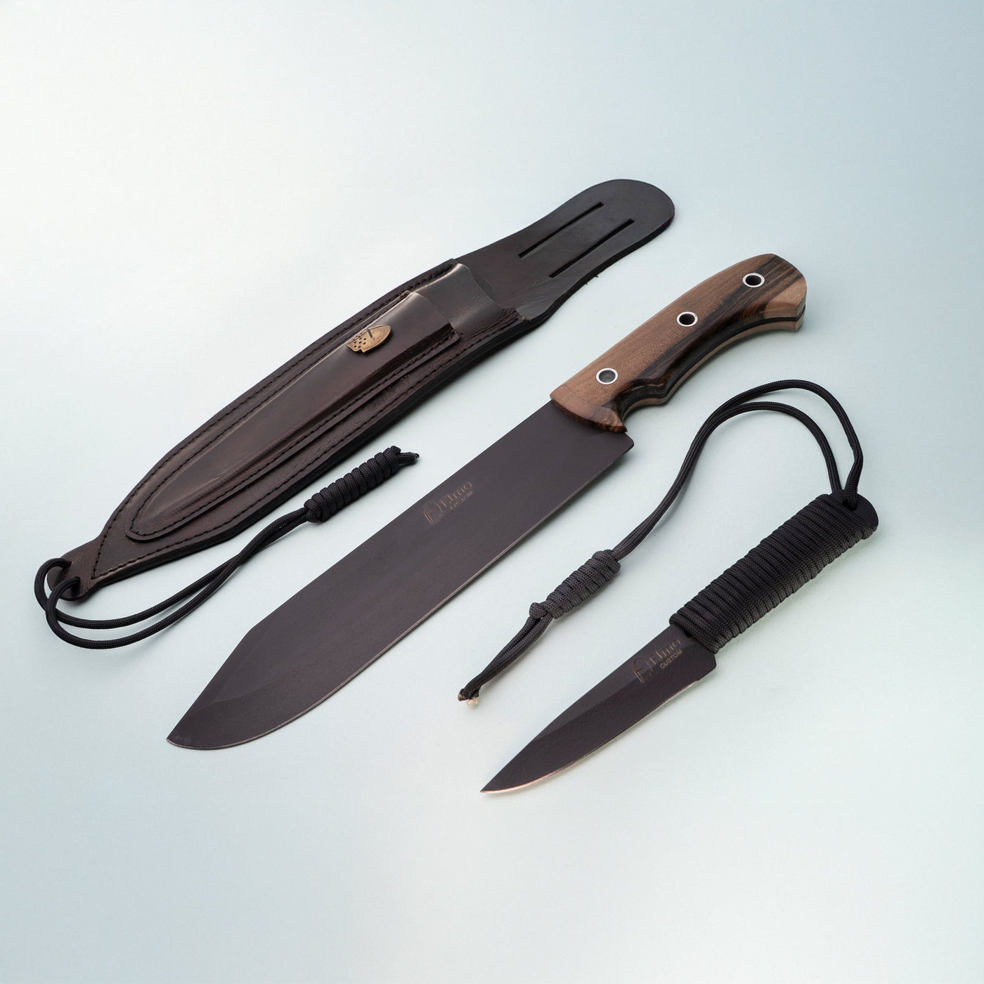 O Conjunto de Mato FR2 é uma ótima opção para uso na natureza, seja em para pescarias, acampamentos, entre outros. As facas são feitas em aço carbono 1070, com pintura epóxi para estética e proteção. O facão é feito em 11 polegadas, 4,75mm de espessura, com cabo em madeira nobre. A faca pequena possui 21 cm de comprimento e acompanha paracord nas cores verde militar, desert e preto.