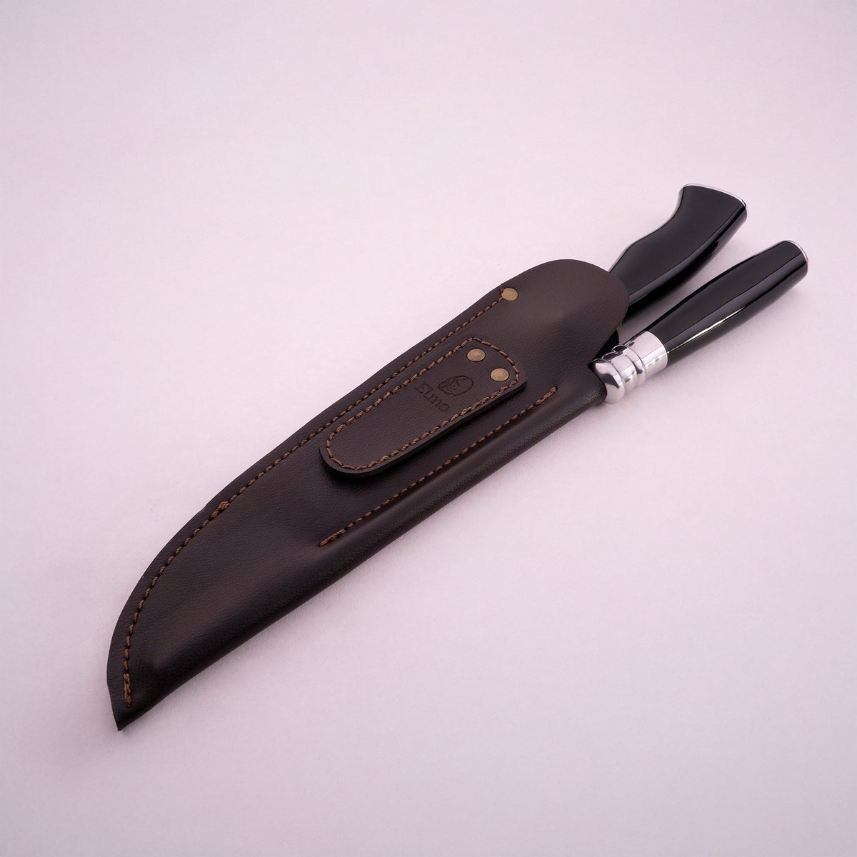 O Conjunto Faca e Chaira Churrasco representa uma combinação excepcional de elegância e desempenho funcional. A faca, confeccionada em aço alemão, destaca-se pela sua robustez com uma lâmina de 3mm, sendo especialmente projetada para o corte preciso de carnes. O cabo preto oferece não apenas uma estética clássica, mas também uma aderência confortável durante o manuseio. A guarda em latão adiciona um toque de sofisticação, enquanto a bainha em couro legítimo proporciona uma forma segura de armazenamento. Com a inclusão da chaira, este conjunto atende às necessidades dos entusiastas de churrasco que valorizam a qualidade dos materiais, o design refinado e a eficácia no preparo de carnes.