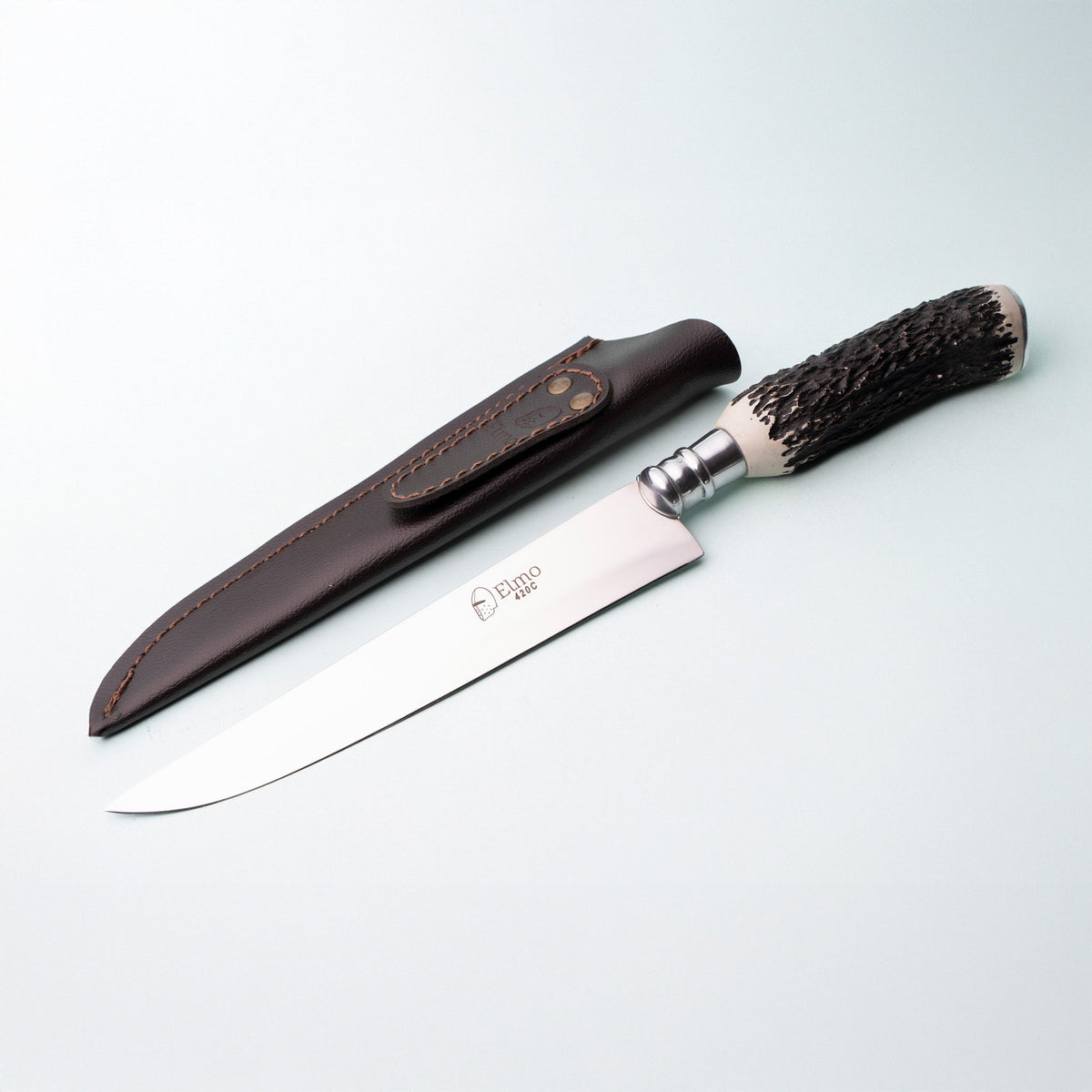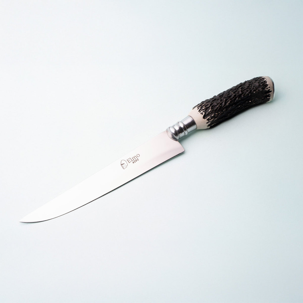 A Faca Elmo AL com Cabo em Chifre de Cervo de 7 polegadas, é uma escolha acessível e versátil para cortar uma variedade de alimentos, especialmente carnes. Com uma lâmina de 2mm de espessura feita de aço inoxidável 420C, oferece durabilidade e eficiência no corte.